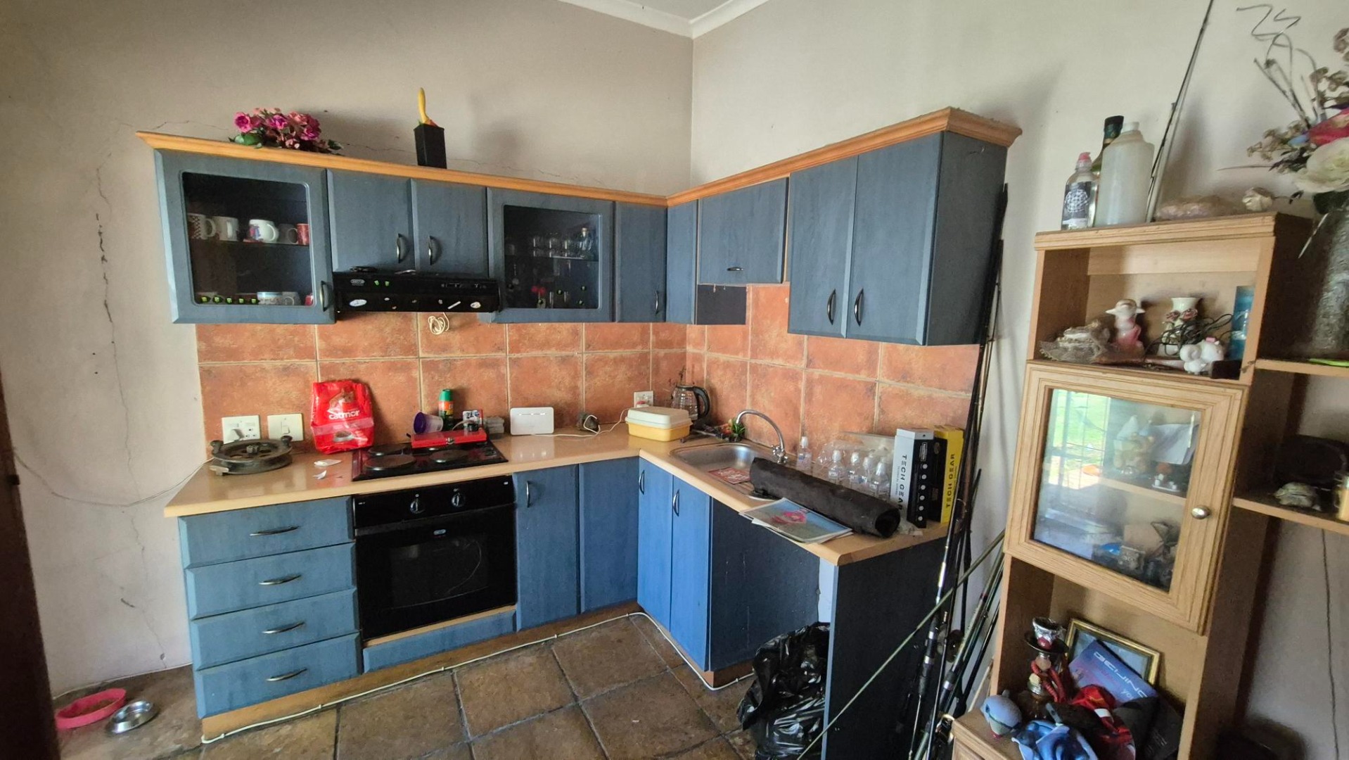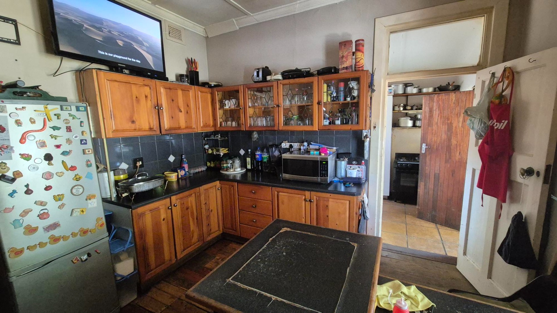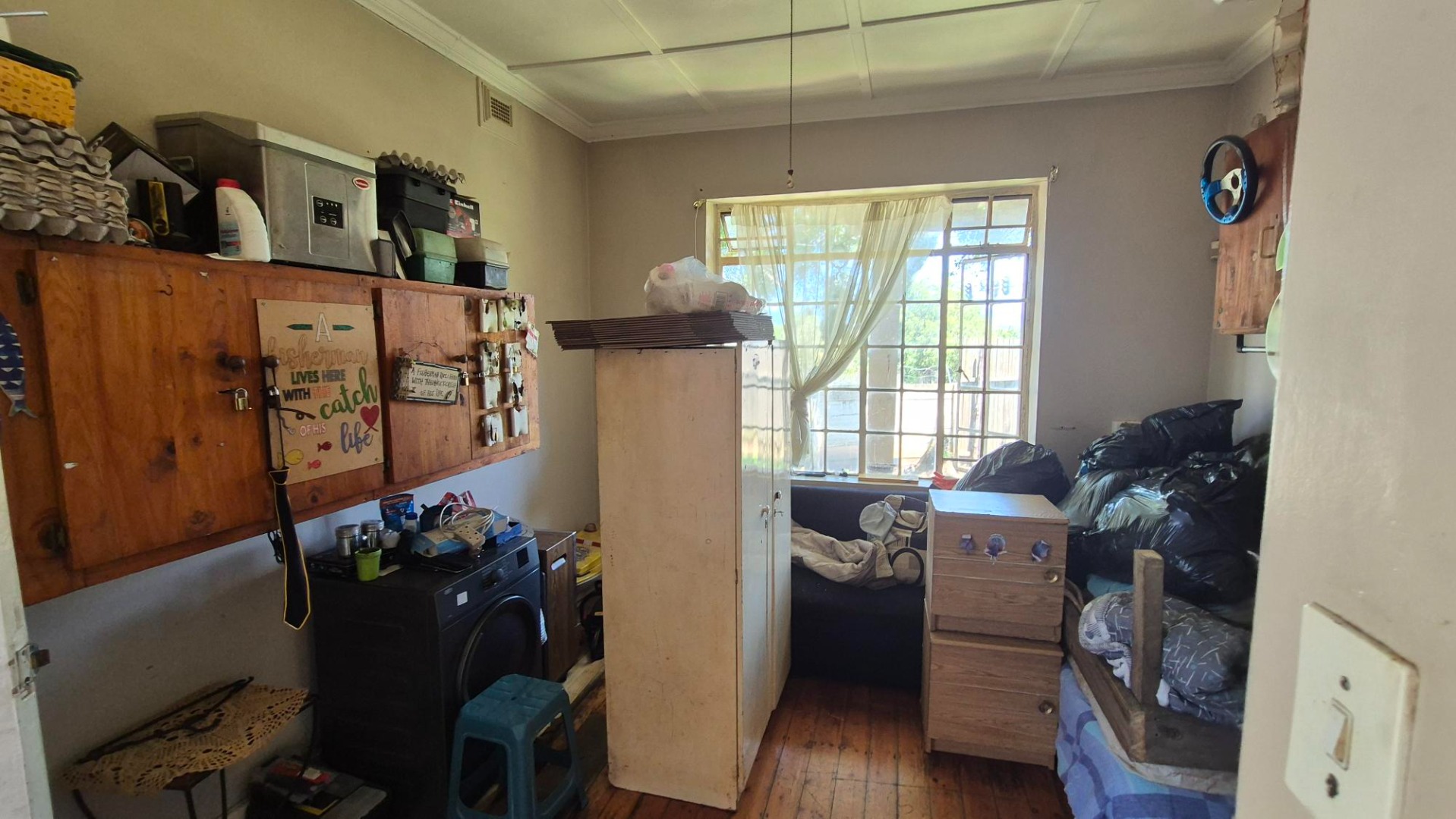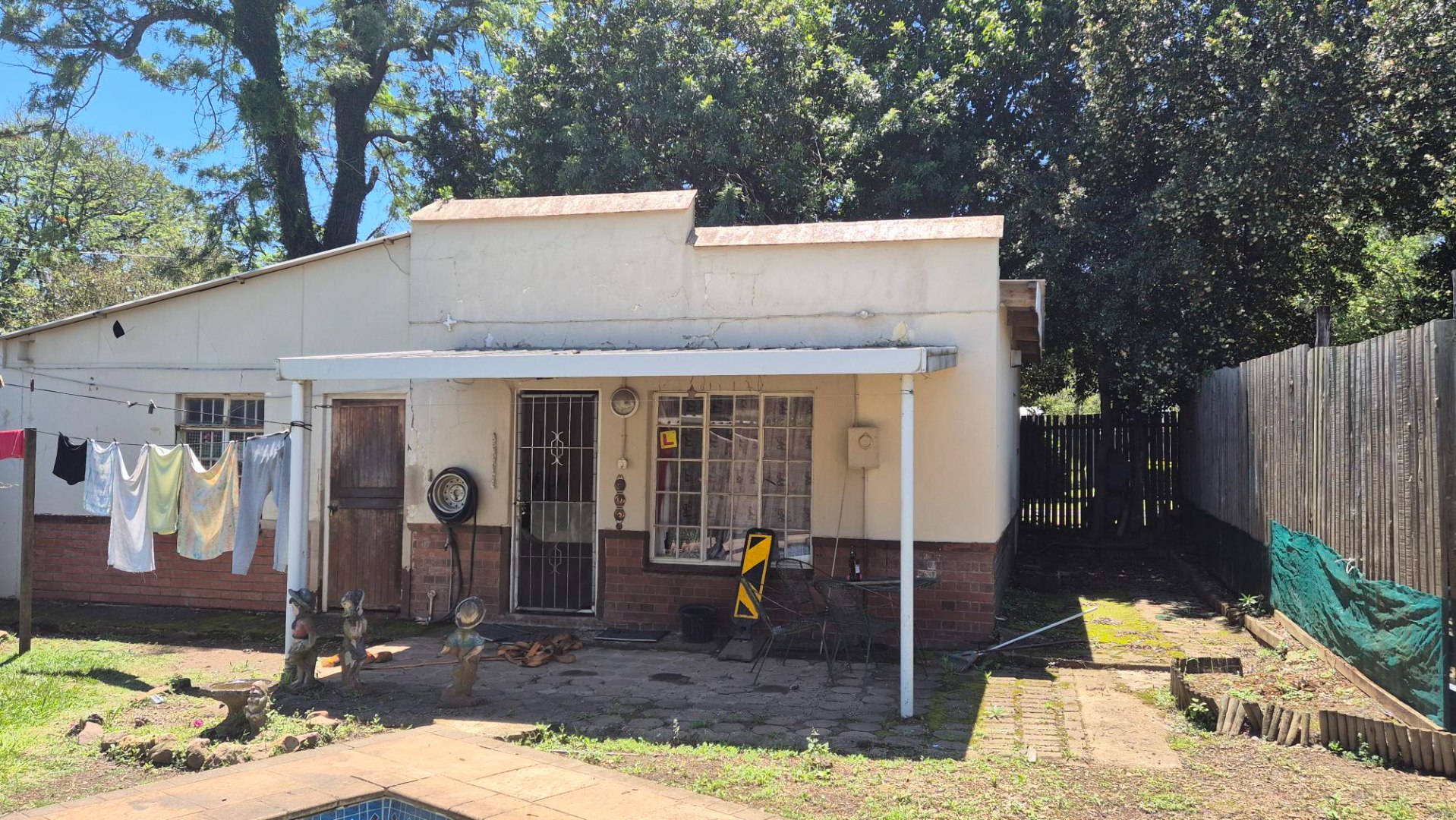 The main house features four bedrooms and two bathrooms, with one bedroom en suite. A spacious combined lounge and dining area provides comfortable communal living, complemented by a fitted kitchen with ample built-in cupboards. While the home does require some maintenance, it presents an excellent opportunity to add value.
