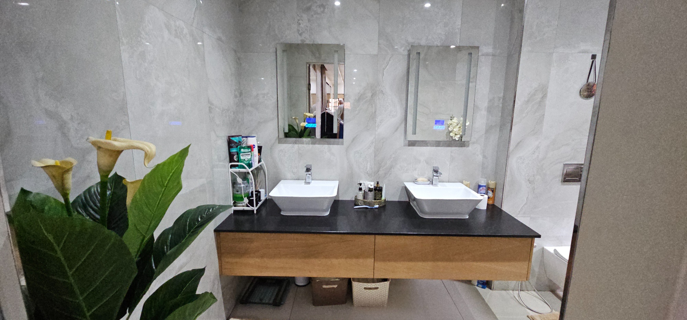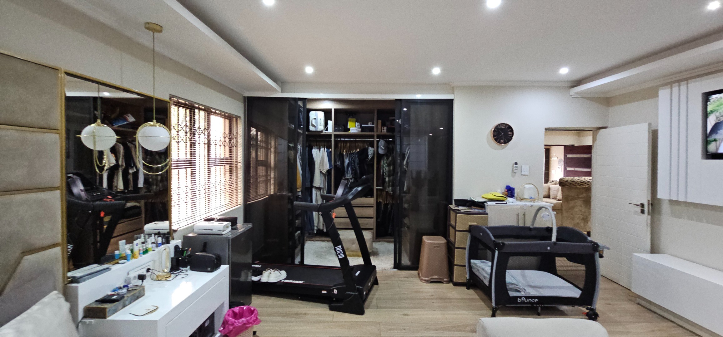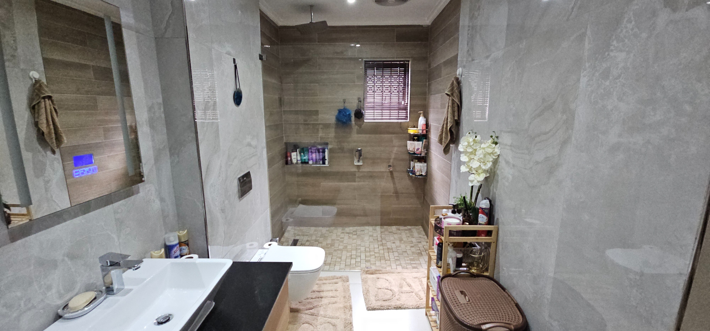 There are 5 bedrooms- 2 of which are ensuite, while a modern family bathroom services the rest of the house . All bedrooms feature built in cupboards and air conditioning. The master bedroom boasts a his and hers closet - the ultimate in storage space aesthetics.