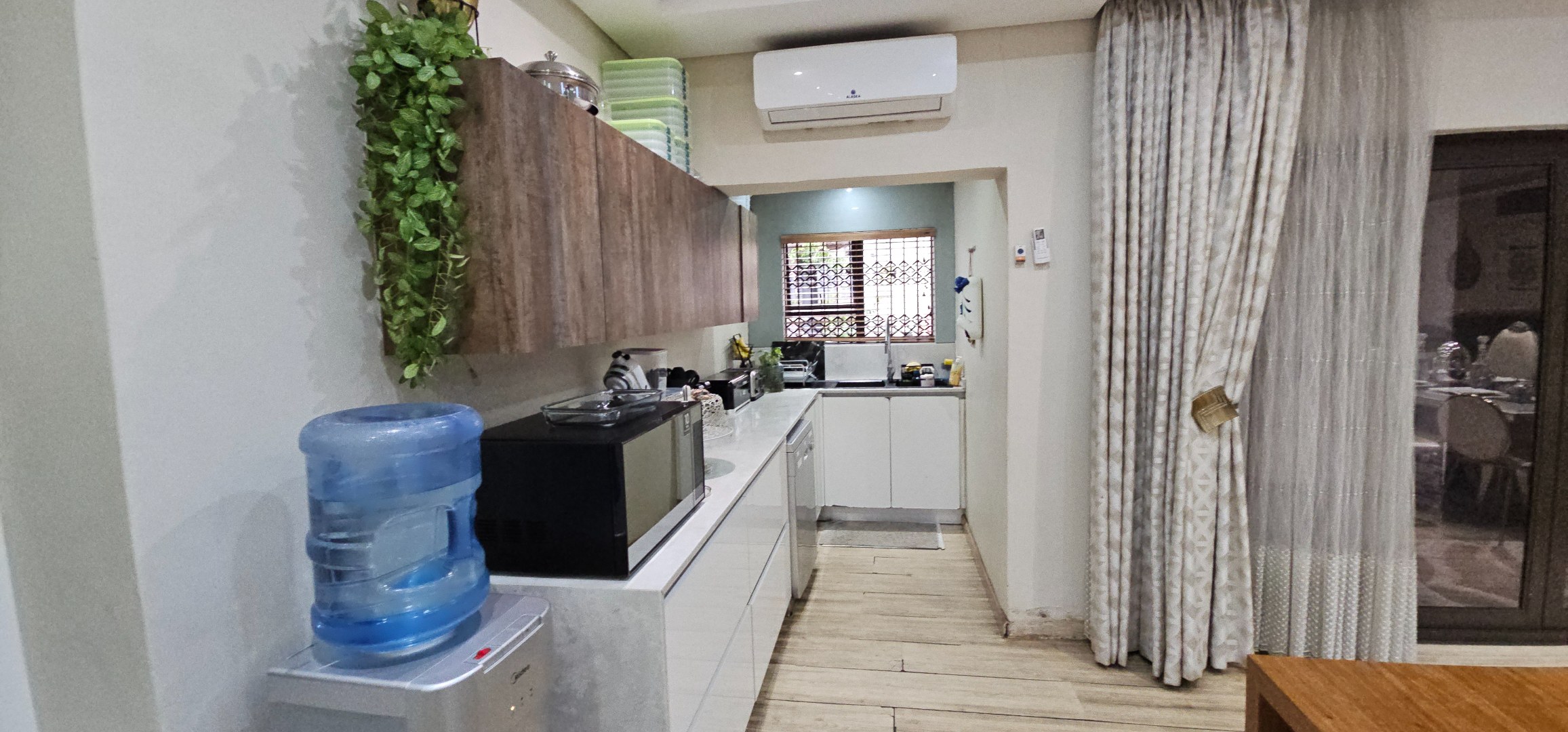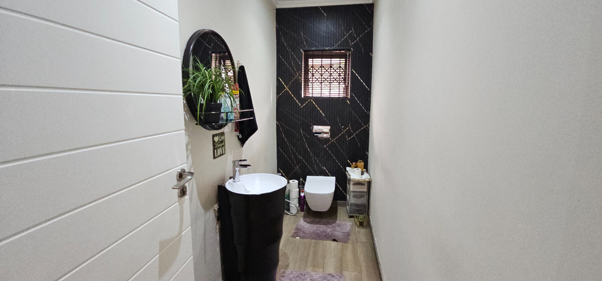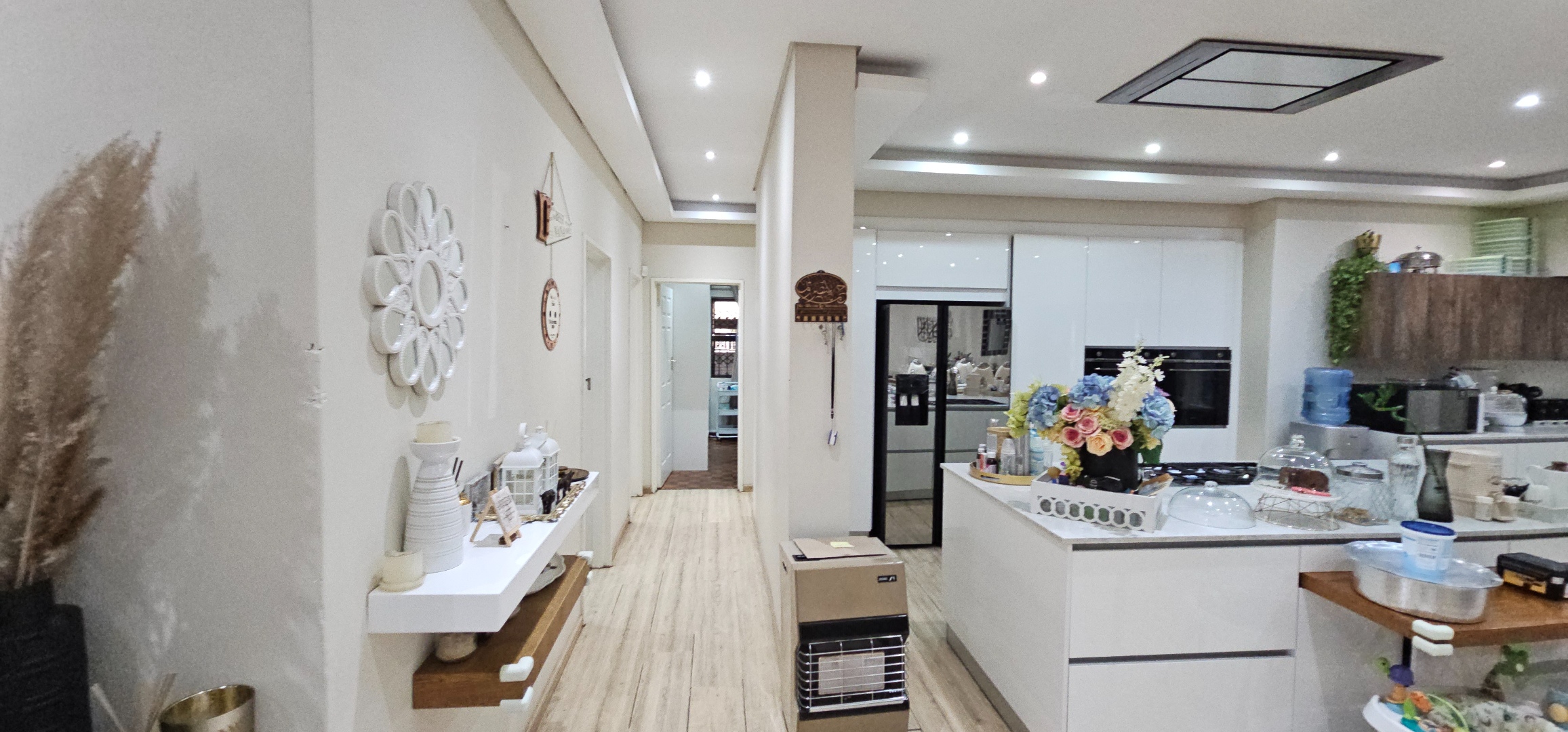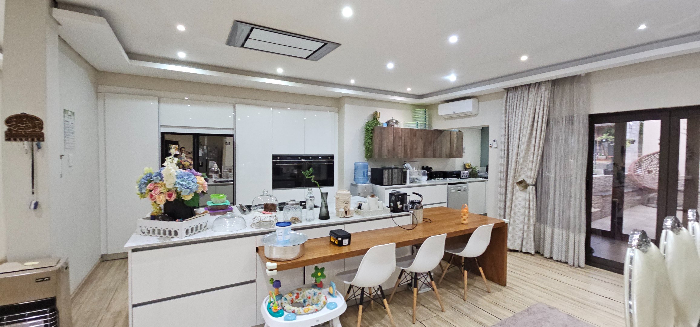 This stunning home offers an open plan living area comprising of a lounge, dining and kitchen area, which is serviced by a modern, exquisite guest toilet. Laminate flooring runs throughout the house and the living area has air conditioning. The kitchen is light and modern , complete with caesar tops and additional seating . This modern kitchen is fully fitted and includes a gas stove and a separate scullery area. The home features a family/TV lounge as well.
