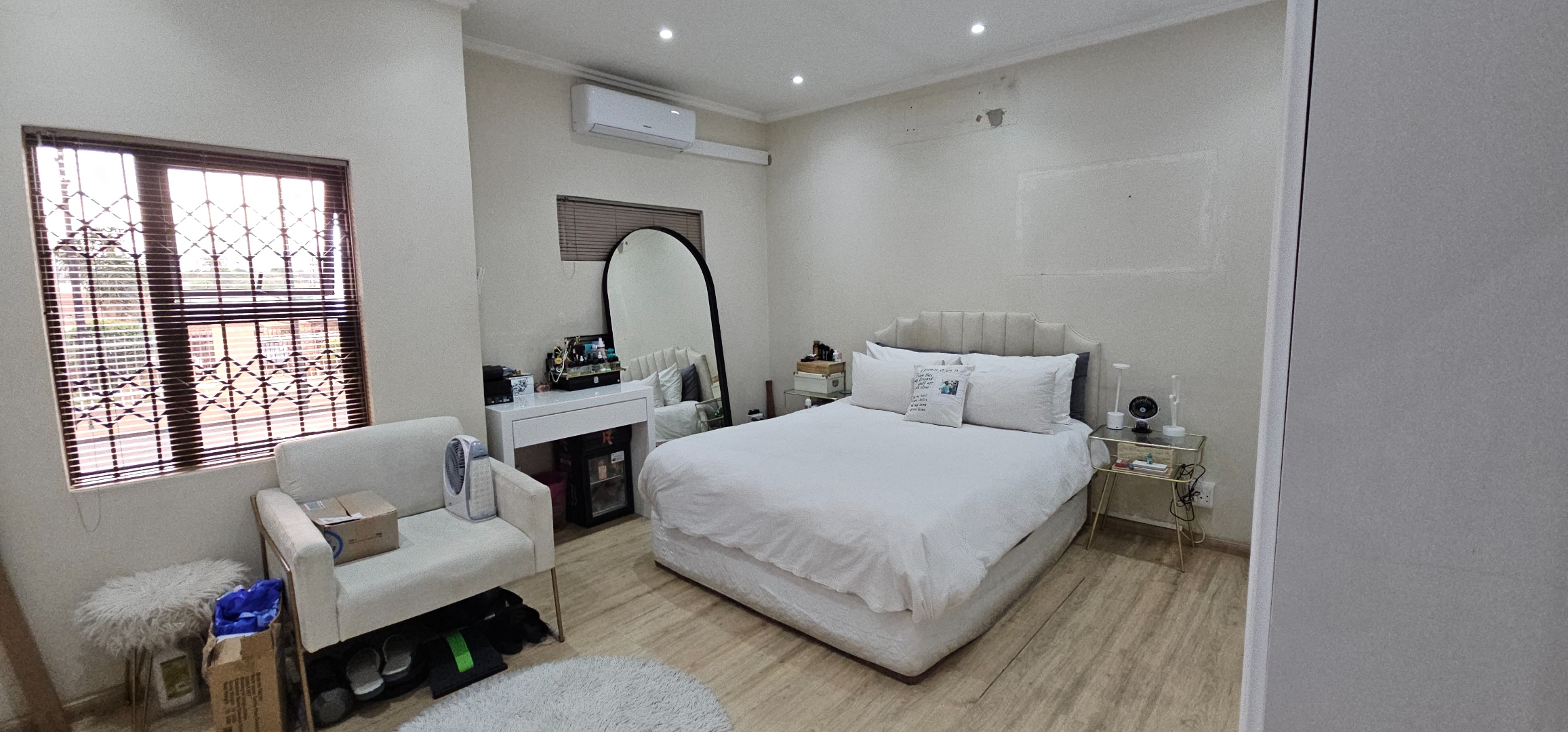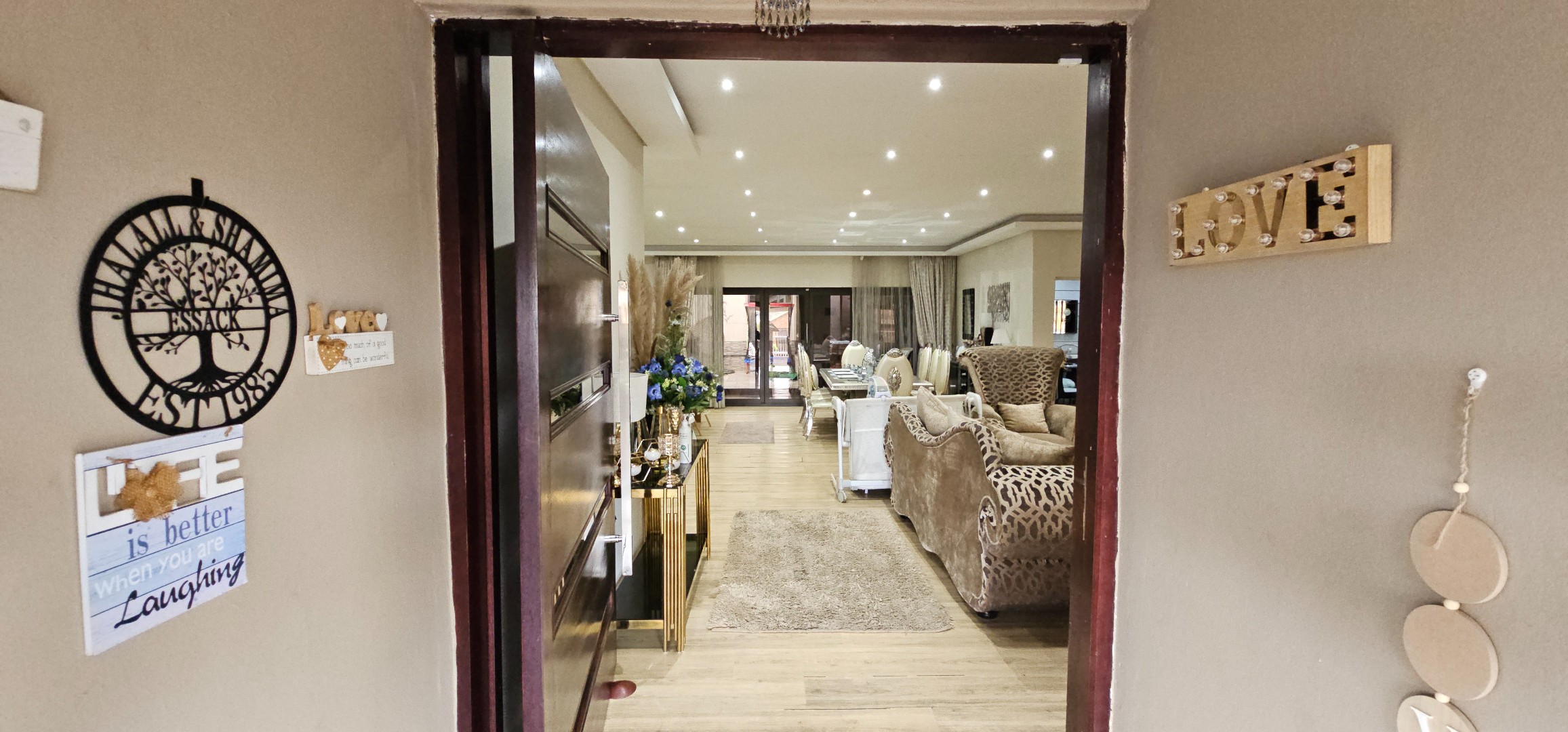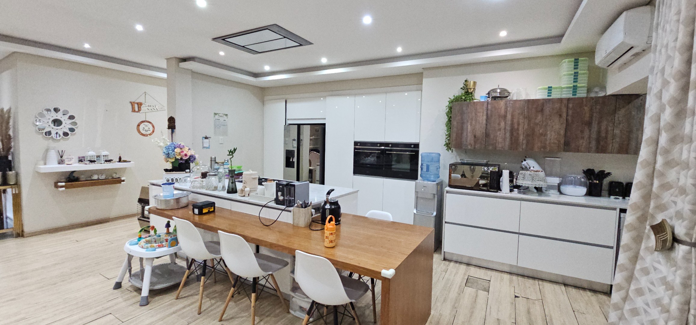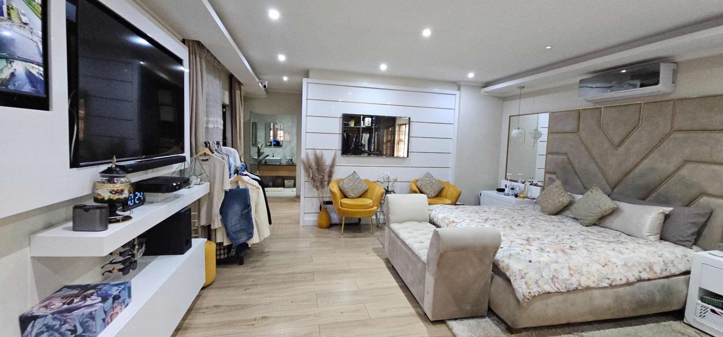This stunning home offers an open plan living area comprising of a lounge, dining and kitchen area, which is serviced by a modern, exquisite guest toilet. Laminate flooring runs throughout the house and the living area has air conditioning. The kitchen is light and modern , complete with caesar tops and additional seating . This modern kitchen is fully fitted and includes a gas stove and a separate scullery area. The home features a family/TV lounge as well.