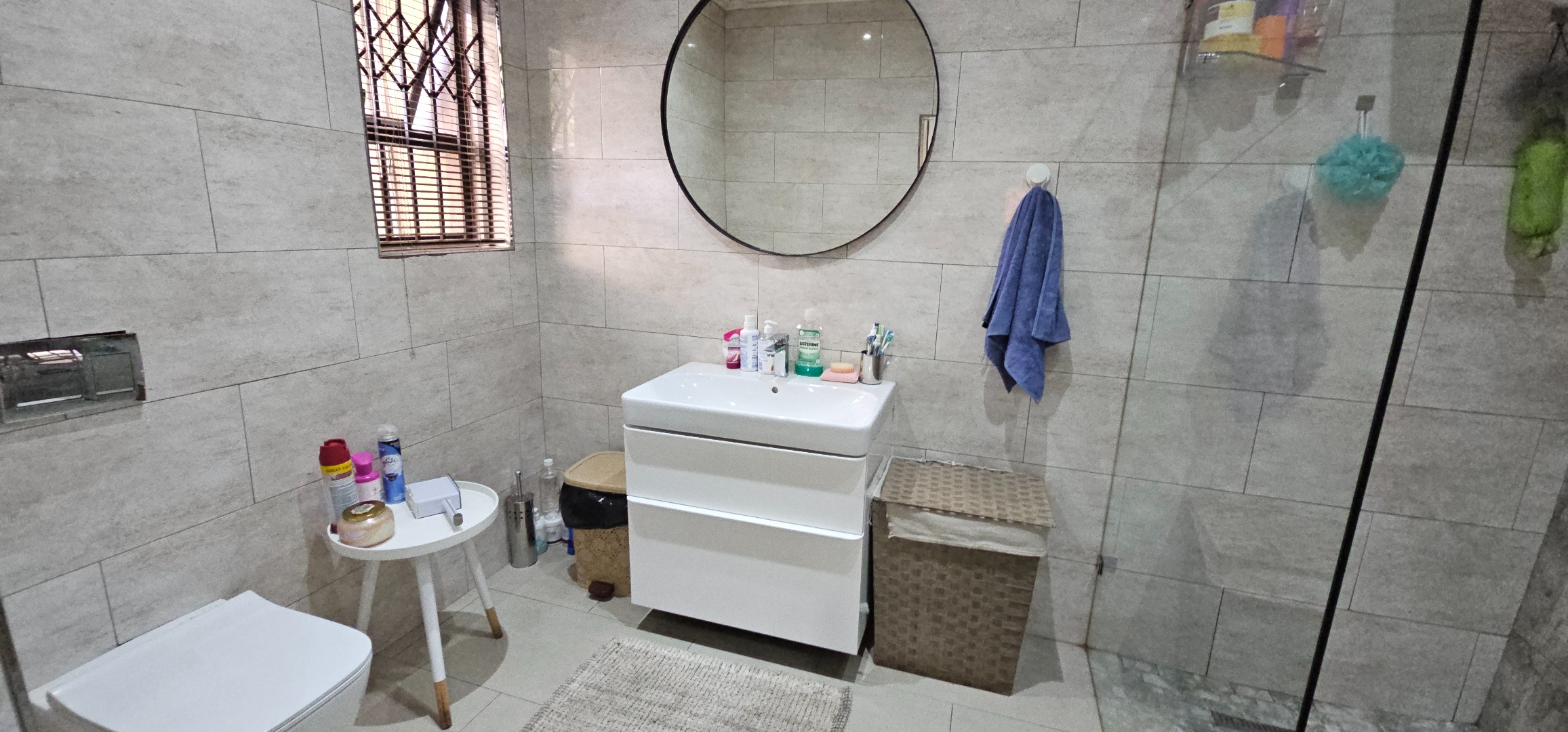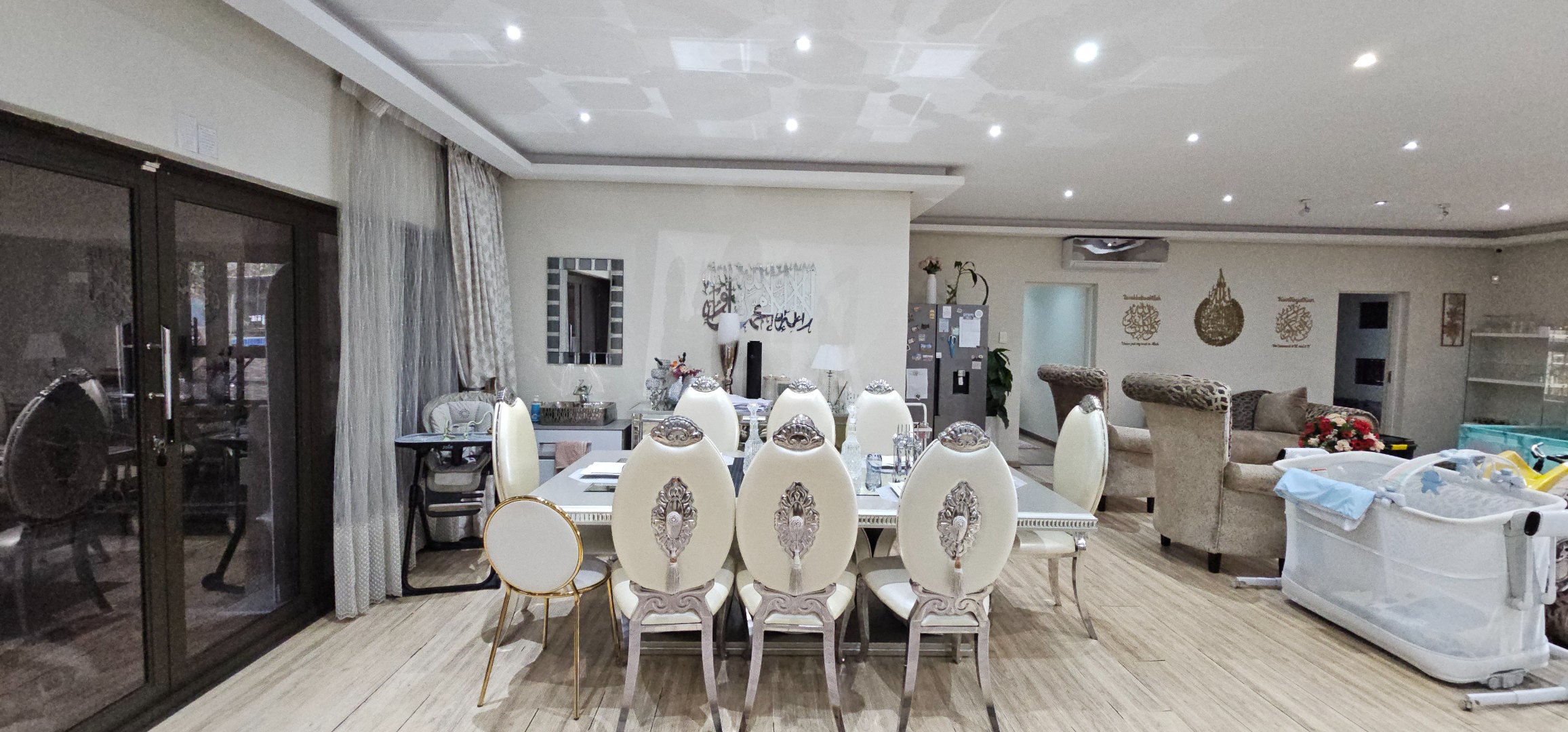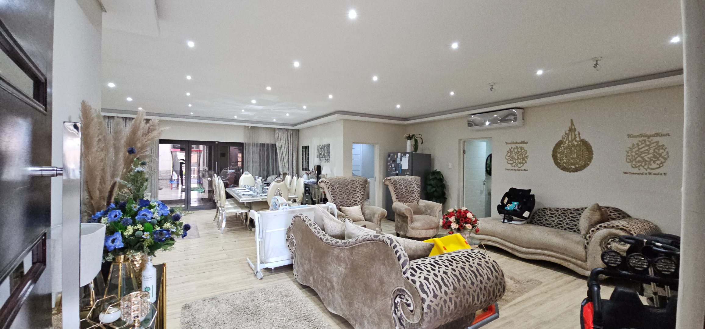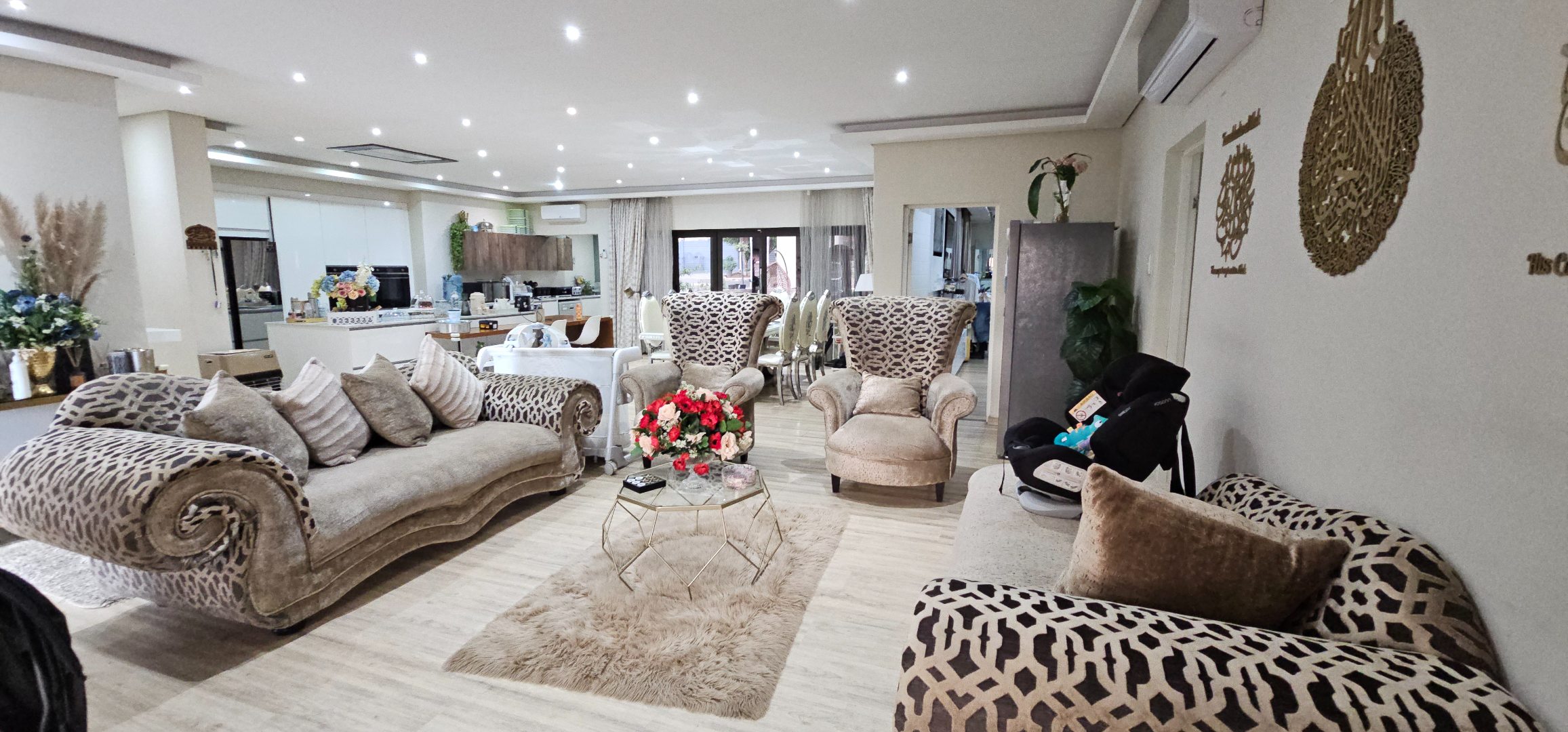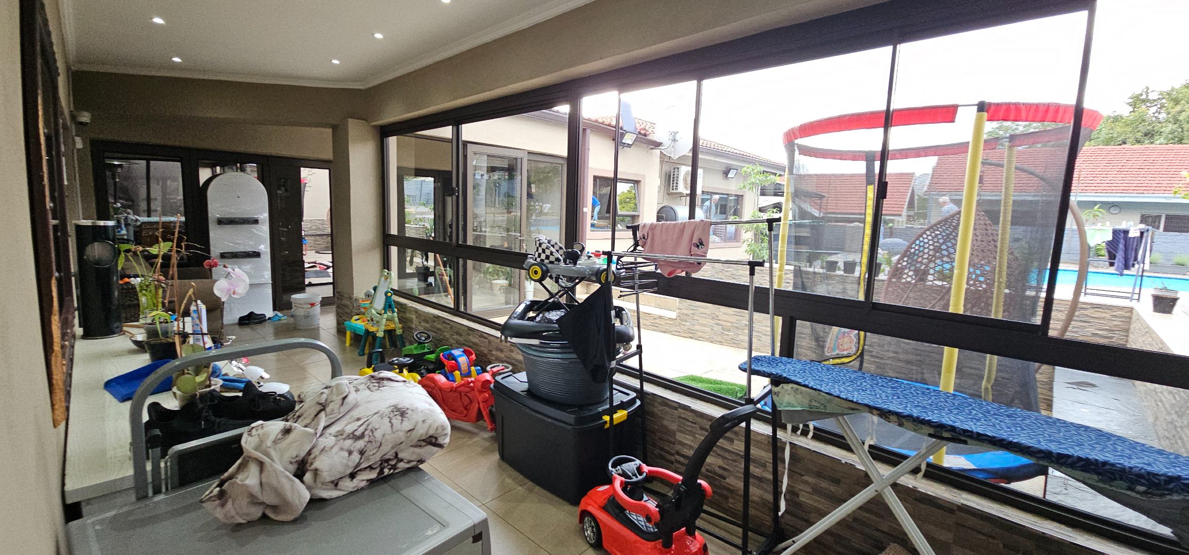 This stunning home offers an open plan living area comprising of a lounge, dining and kitchen area, which is serviced by a modern, exquisite guest toilet. Laminate flooring runs throughout the house and the living area has air conditioning. The kitchen is light and modern , complete with caesar tops and additional seating . This modern kitchen is fully fitted and includes a gas stove and a separate scullery area. The home features a family/TV lounge as well.