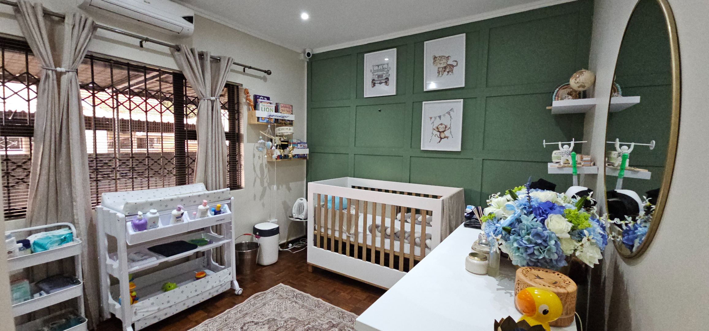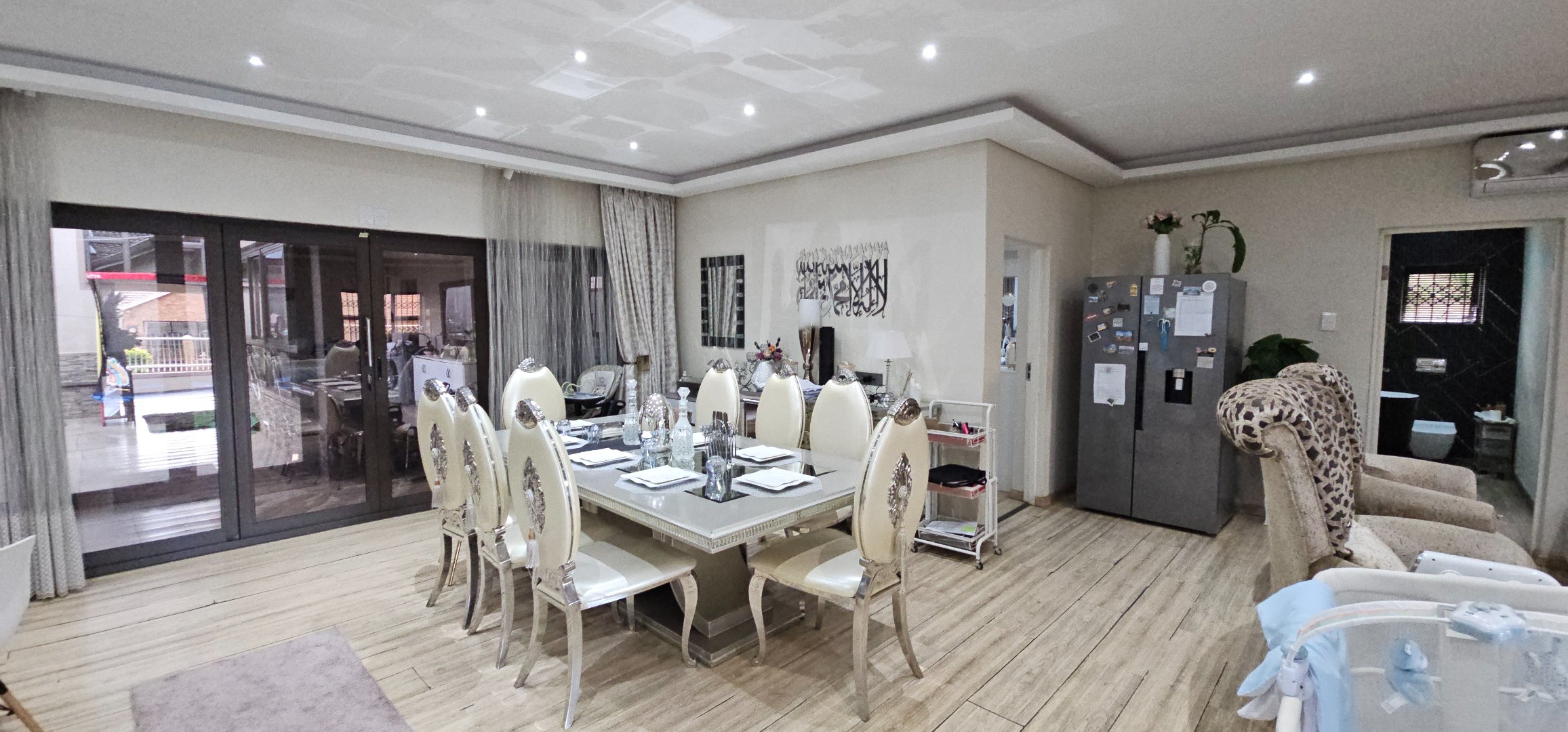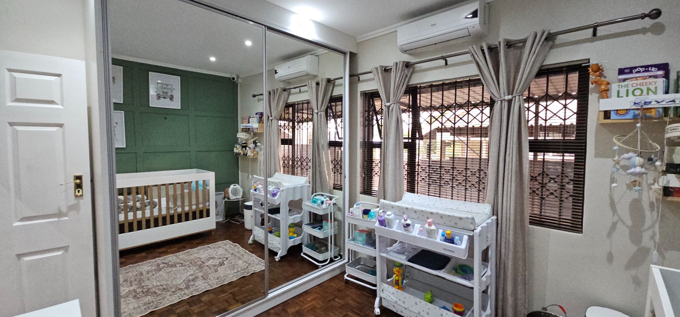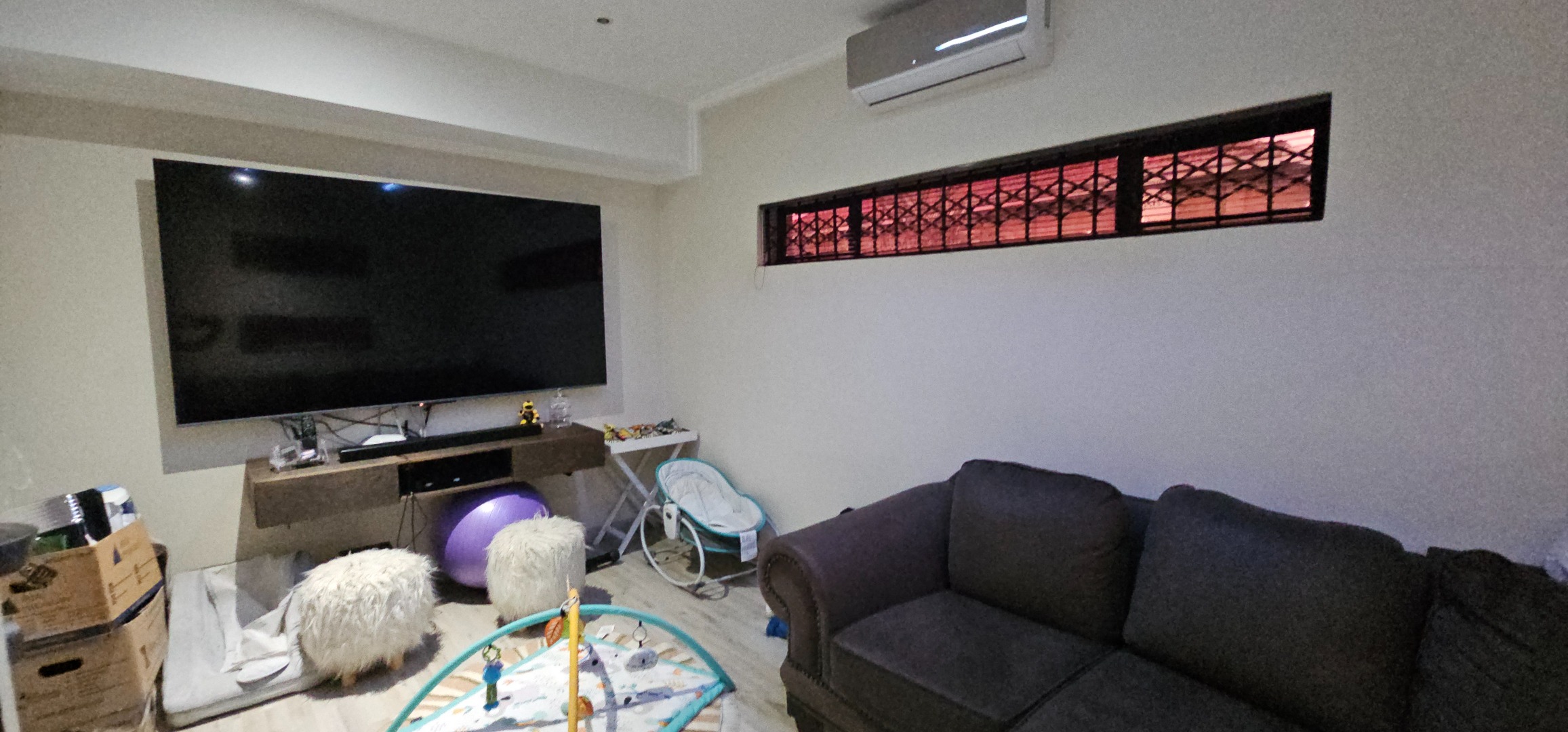 This stunning home offers an open plan living area comprising of a lounge, dining and kitchen area, which is serviced by a modern, exquisite guest toilet. Laminate flooring runs throughout the house and the living area has air conditioning. The kitchen is light and modern , complete with caesar tops and additional seating . This modern kitchen is fully fitted and includes a gas stove and a separate scullery area. The home features a family/TV lounge as well.