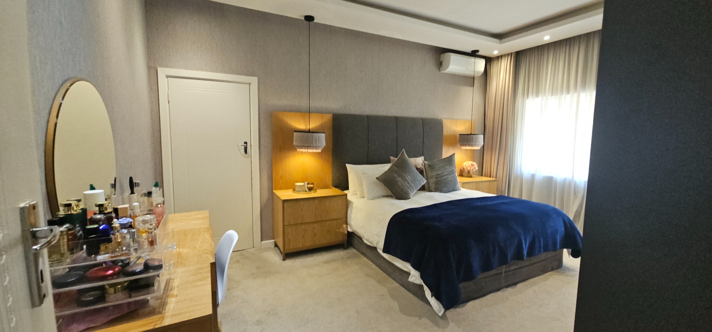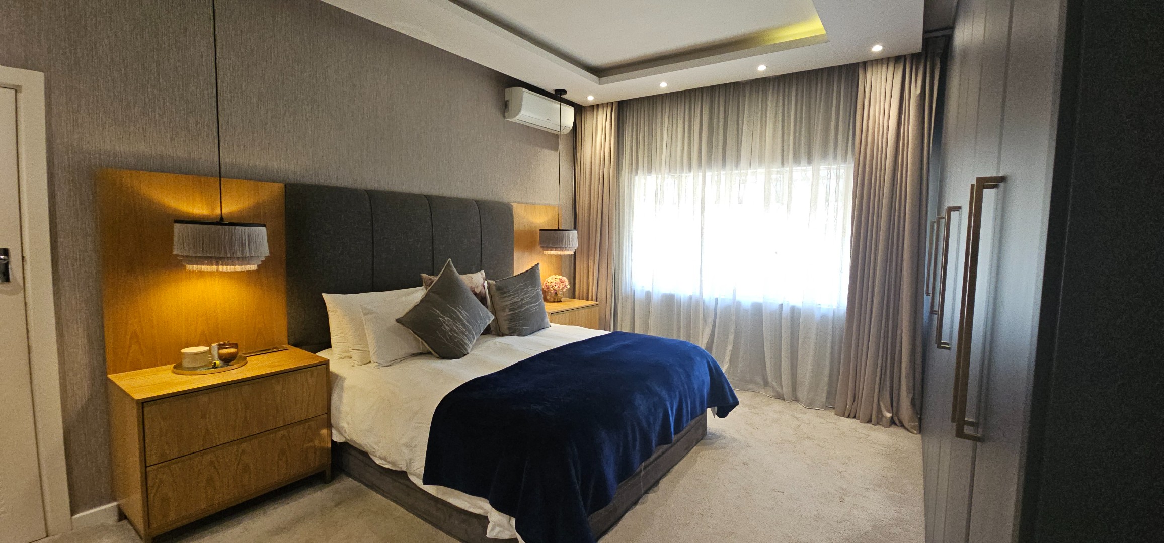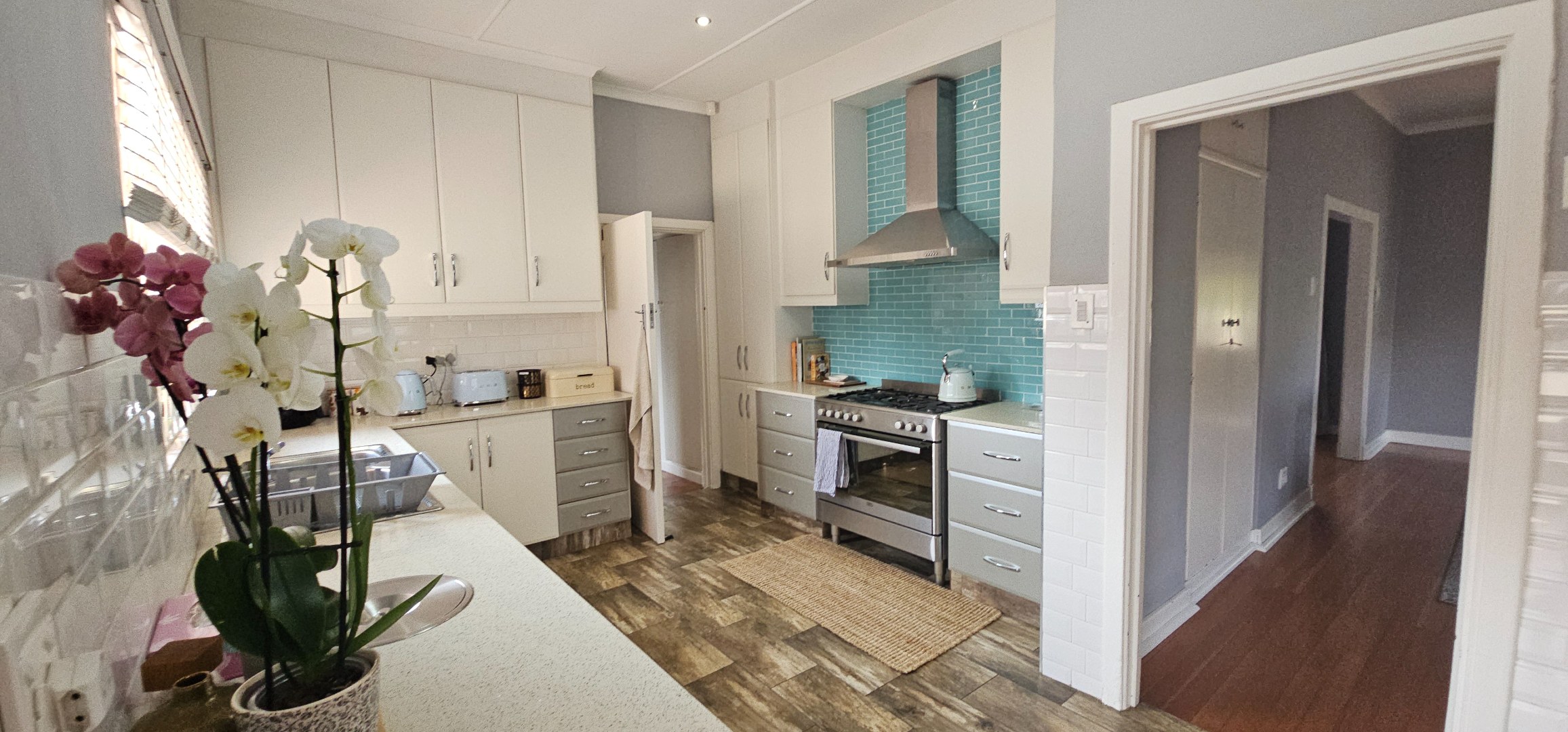 On the interior of the property is an open plan lounge and dining area that are spacious and light , creating a modern, inviting atmosphere. The kitchen is a chef’s delight, completely fitted, with a gas and electric stove. Showcasing the heart of the home, the kitchen is designed with a sophisticated, trendy aesthetic adding to the light and appeal of this interior.