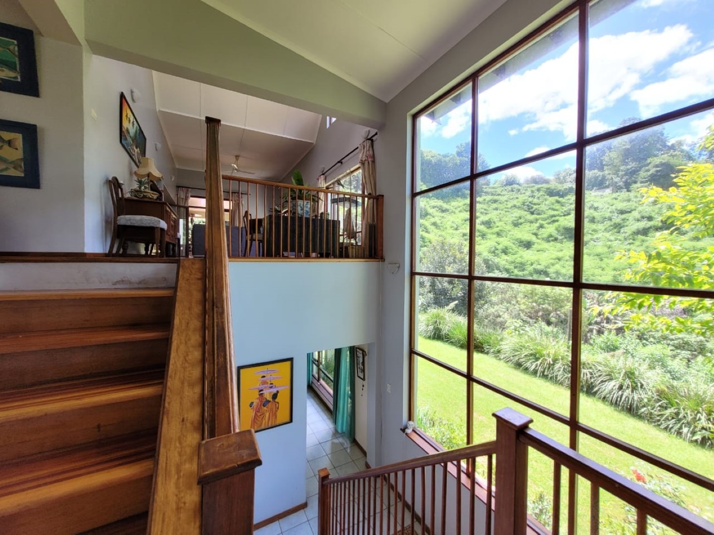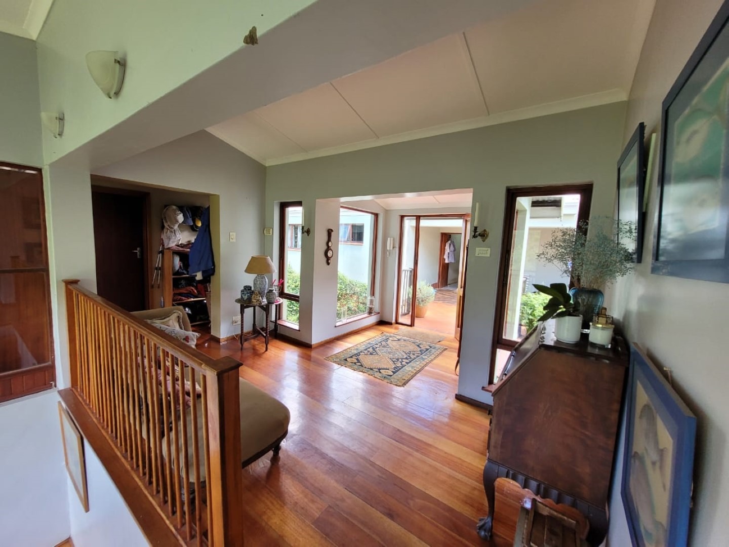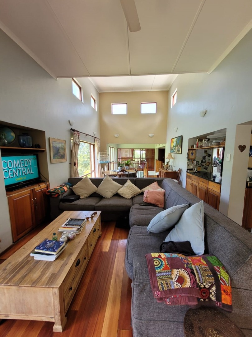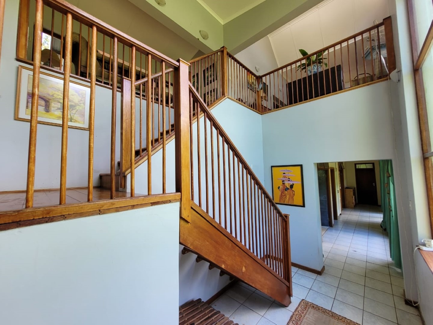 Step inside to a bright, multi-level interior characterized by high ceilings and abundant natural light streaming through numerous large windows. A prominent wooden staircase leads to an upper landing and a versatile loft/mezzanine space, adding character and functionality. The home offers a comfortable lounge, a dedicated dining room, and a family TV room, providing ample space for relaxation and entertainment. The functional kitchen, equipped with natural wood cabinetry and extensive counter space, offers practical storage and a homely feel.