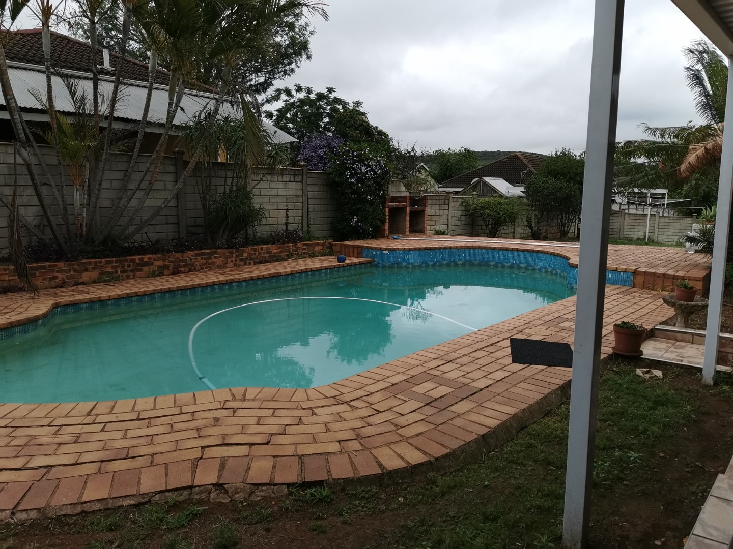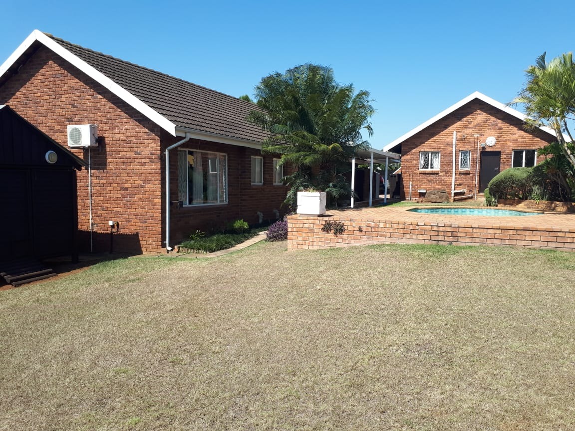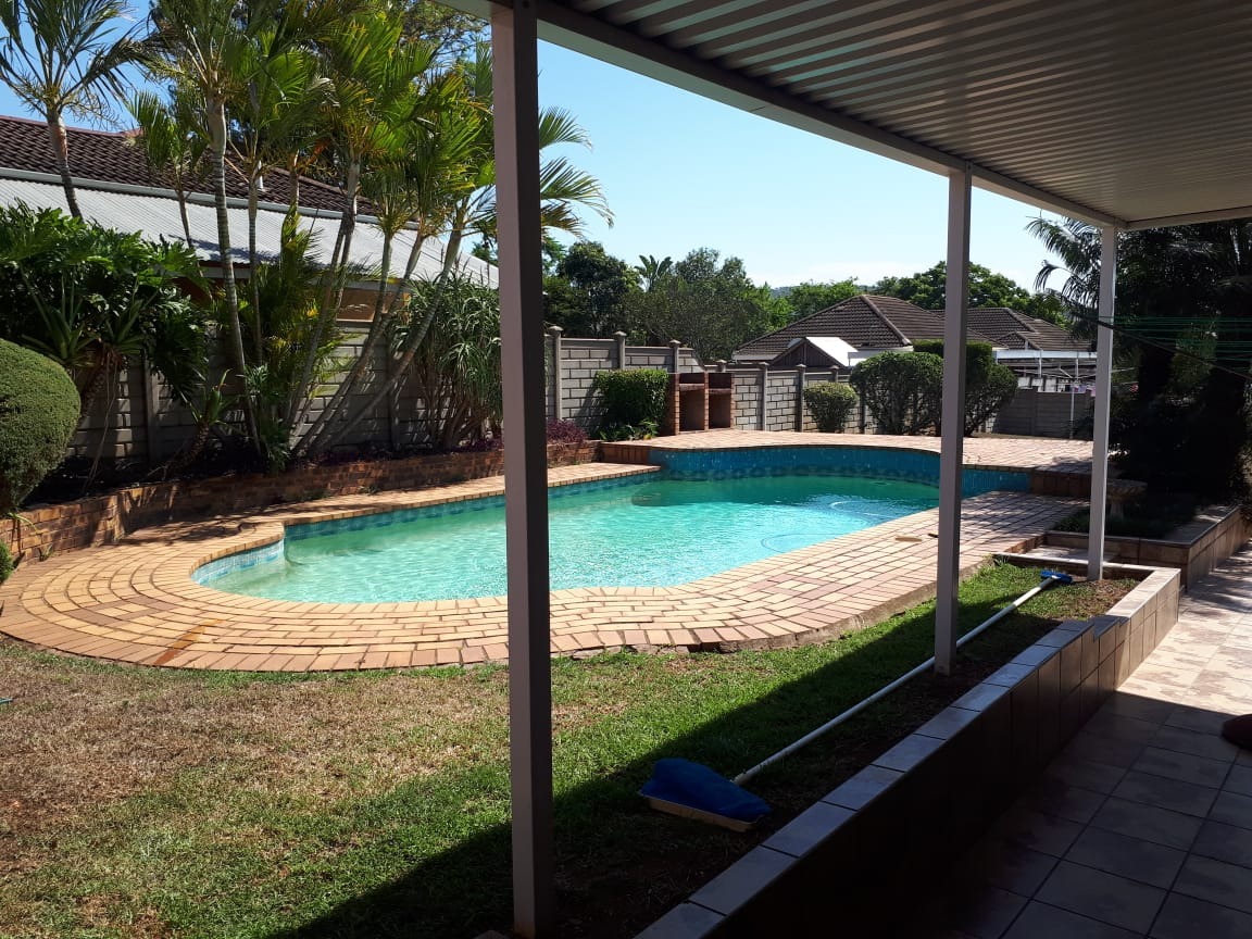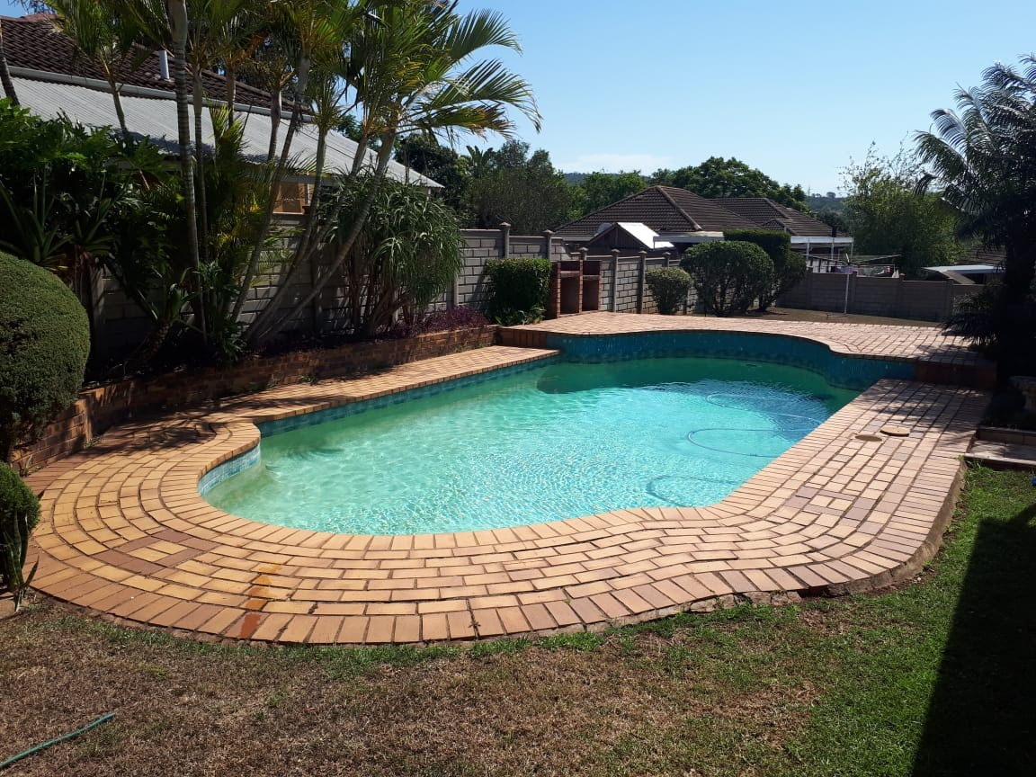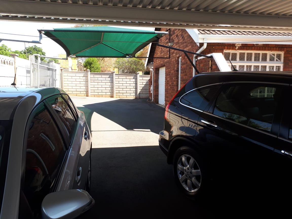 basin and toilet. Main bathroom has bath basin and toilet. Kitchen is fitted, tiled and comes with stove. Wooden floors in lounge, dining room and bedrooms. Spacious garden with swimming pool and wendy hut for extra storage. There is a single lock up garage with 3 undercover parking’s. Including a bachelor cottage with small kitchen and bathroom. Rent excludes utilities.