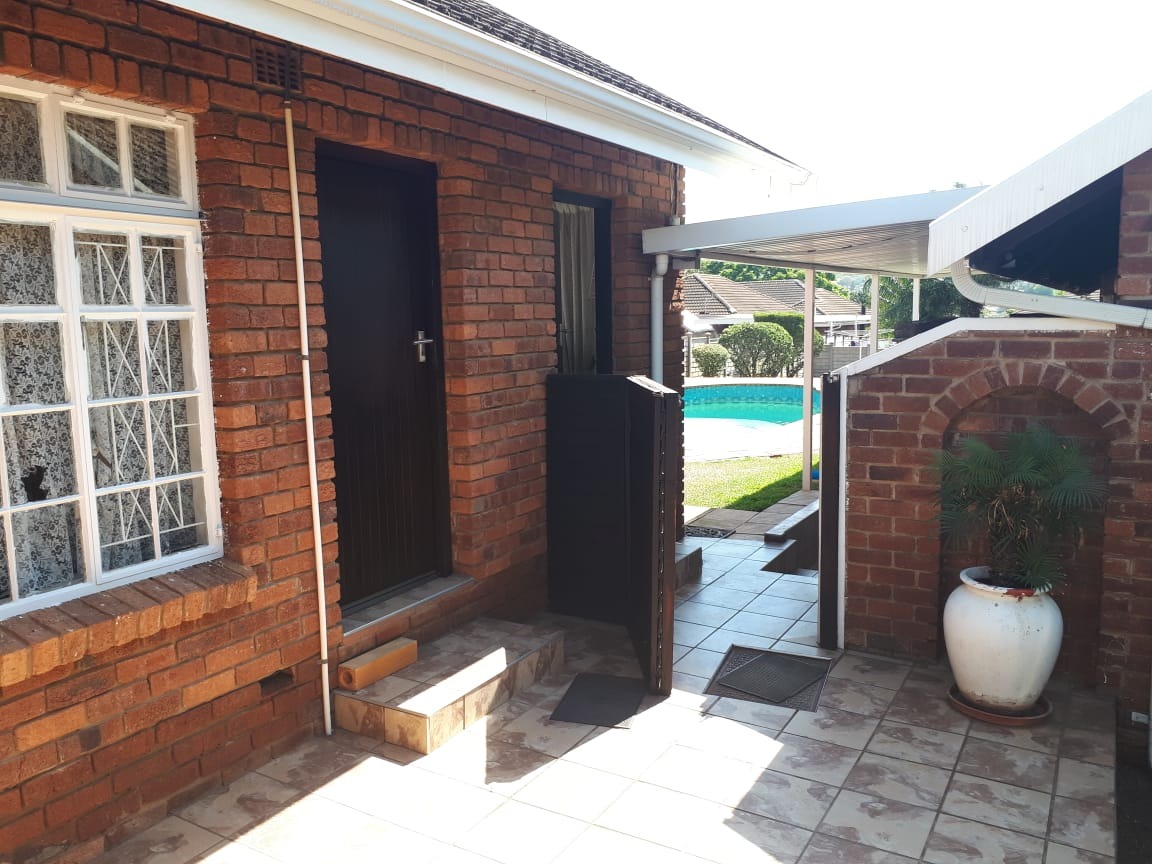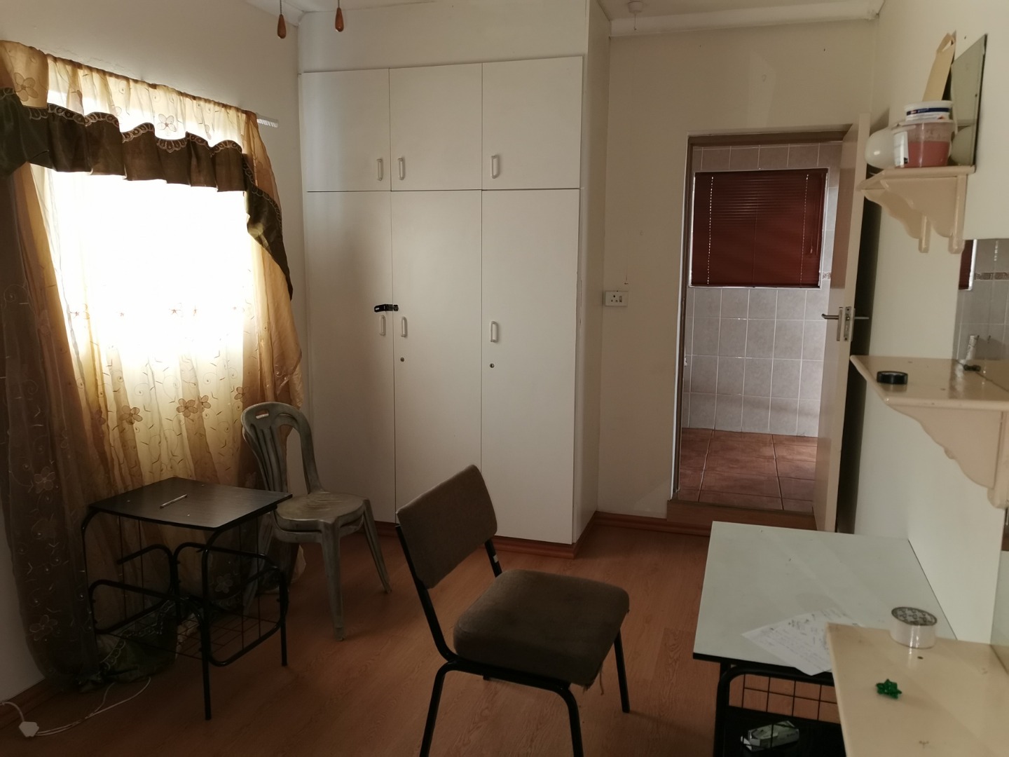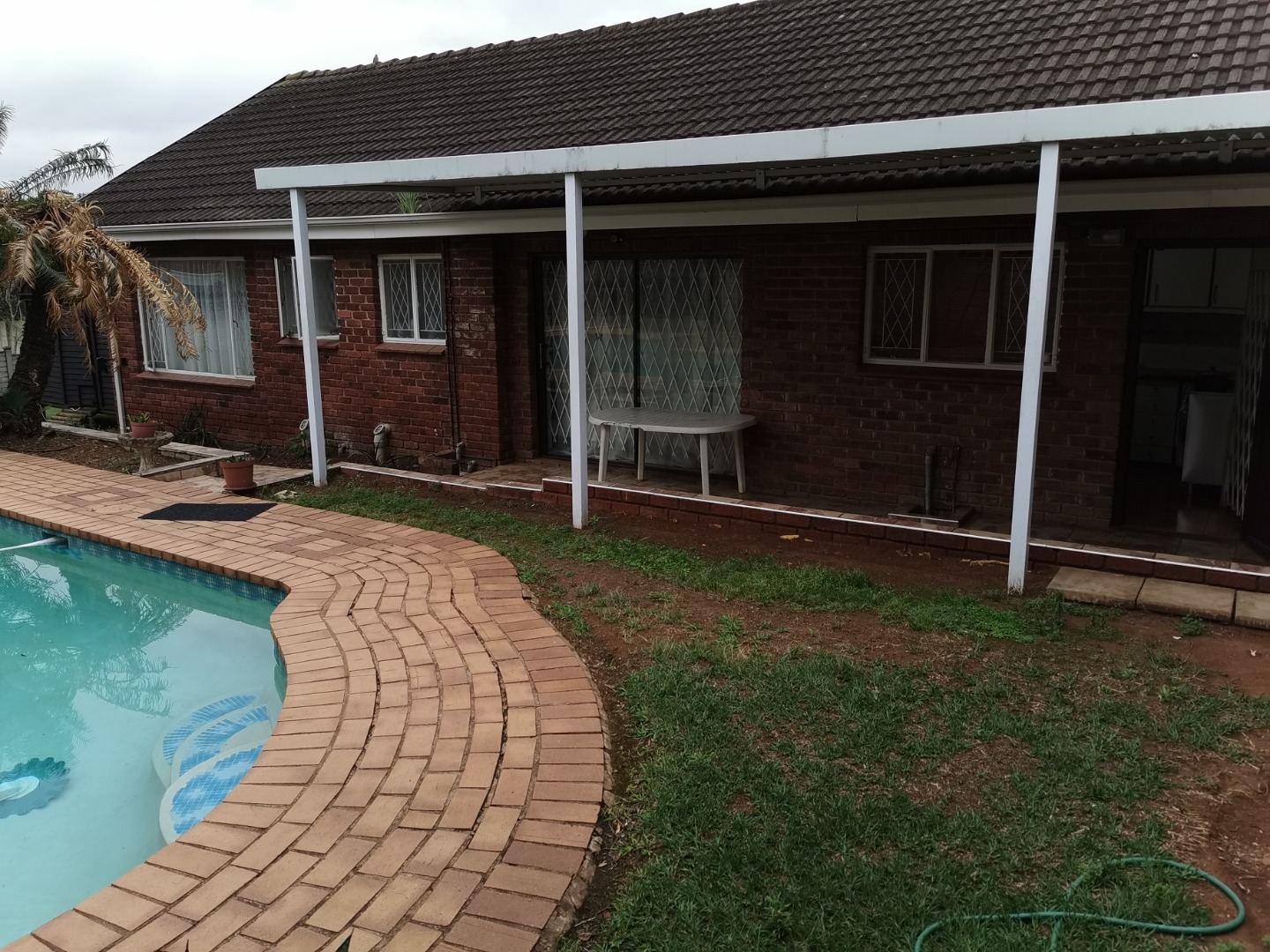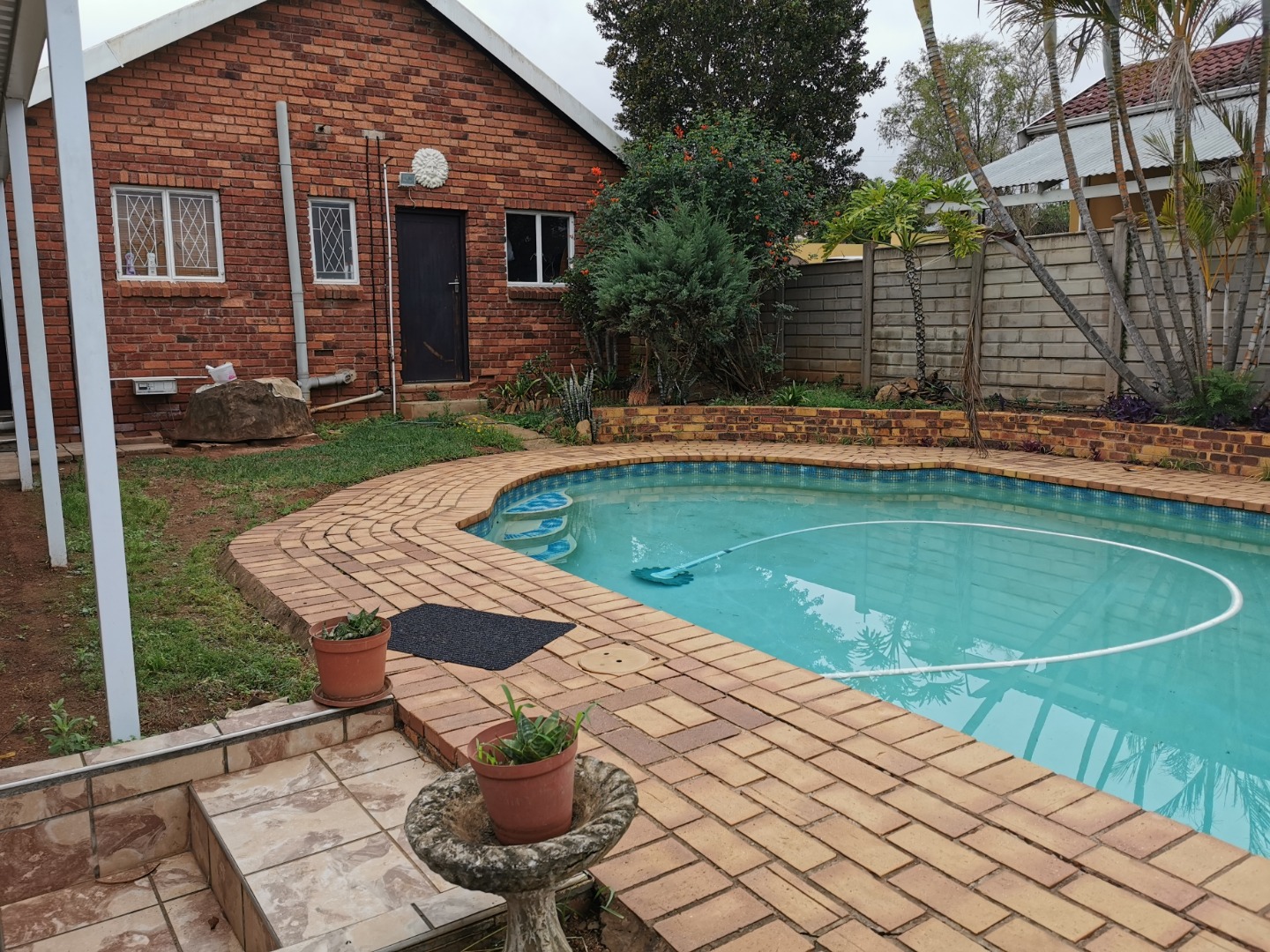 basin and toilet. Main bathroom has bath basin and toilet. Kitchen is fitted, tiled and comes with stove. Wooden floors in lounge, dining room and bedrooms. Spacious garden with swimming pool and wendy hut for extra storage. There is a single lock up garage with 3 undercover parking’s. Including a bachelor cottage with small kitchen and bathroom. Rent excludes utilities.