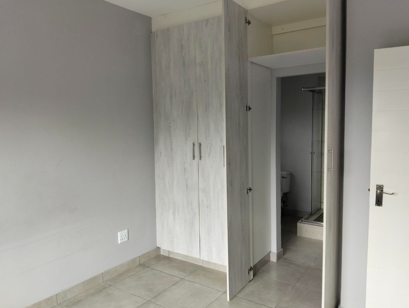 The bedroom is fitted with built-in cupboards and features a neat en-suite bathroom with a shower, basin and toilet.