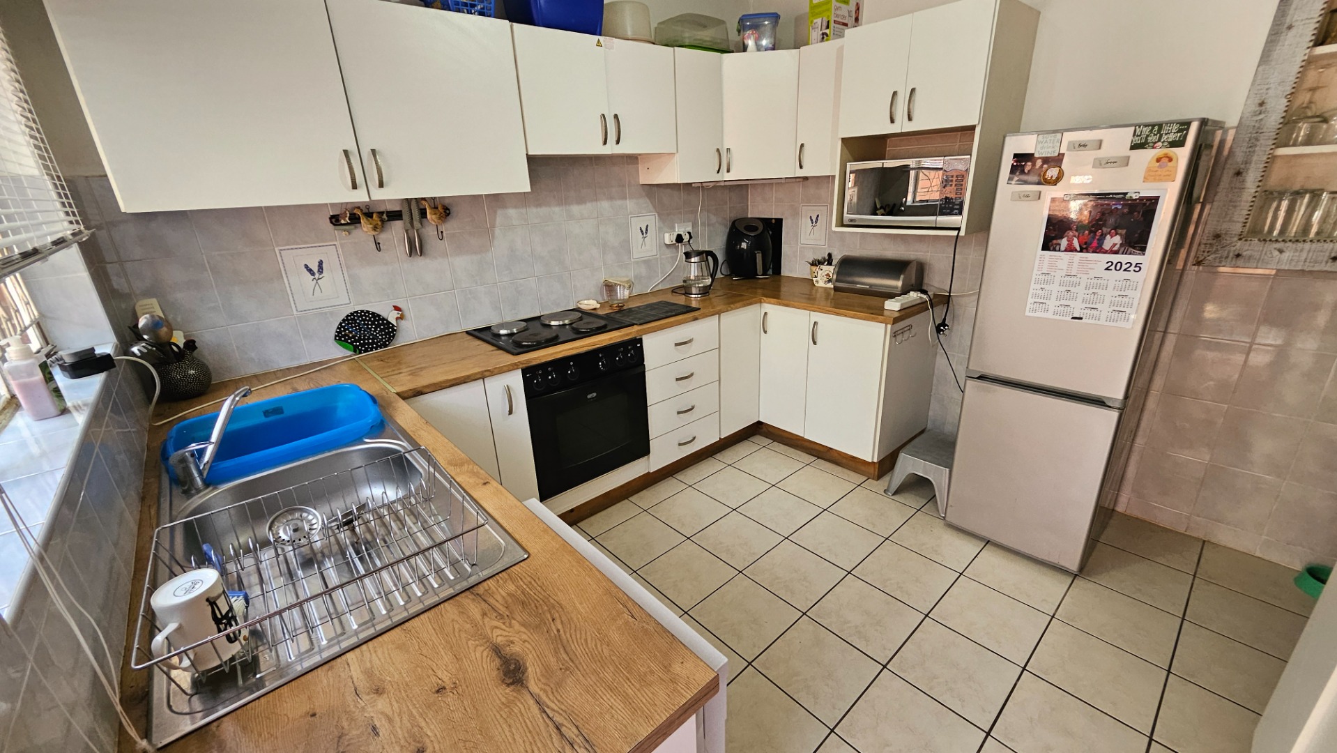 The kitchen is fully fitted, amply cupboard space and a built in oven and hob. A guest toilet and basin are down stairs for your convenience. There is a lock up garage and extra parking.